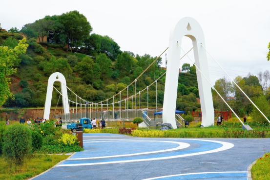 在渭源县渭河城区段,碧波荡漾的渭河水荡涤着城市喧嚣。河岸绿树成荫,其间花草点缀。玻璃浮桥连通两岸,桥下流水潺潺。