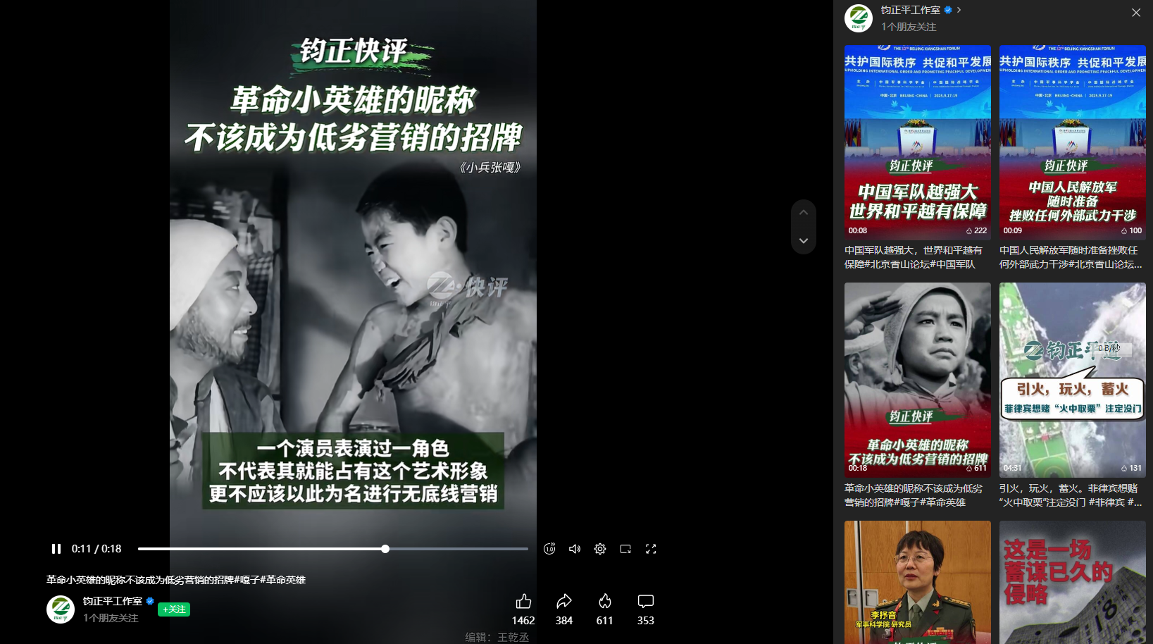 9月18日,“九一八”事变爆发94周年当天,《解放军报》社“钧正平”发布“钧正快评”:革命小英雄的昵称不该成为低劣营销的招牌。