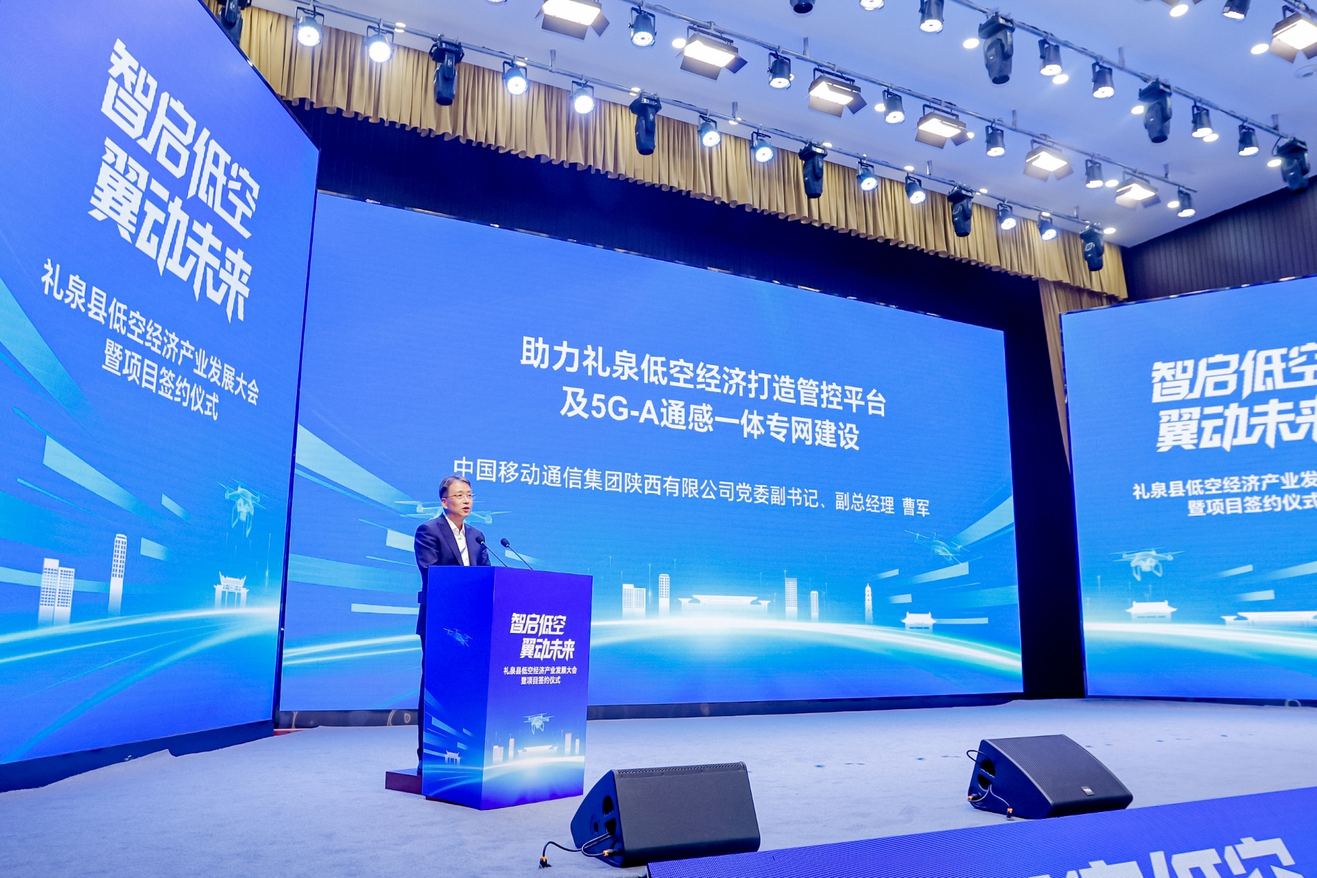 中国移动通信集团陕西有限公司党委副书记、副总经理曹军介绍助力礼泉低空经济,打造管控平台及共建5G-A通感一体专网建设情况。他表示,5G-A通感一体专网是低空经济的“数字底座”,中国移动通信集团陕西公司以试飞基地为核心启动区,高标准规划建设5G-A通感一体基站示范网络,实现对核心空域300米以下的无缝覆盖与多维感知。下一步,他们分阶段将网络能力辐射至全县重点区域,推动礼泉低空经济从“应用试点”向“产业高地”跨越。