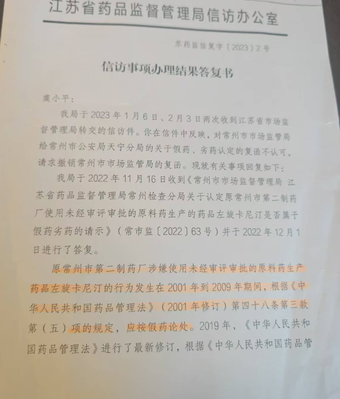 虞小平称,提前终止了与三维公司的合作后,兰陵制药和三维公司在此后的十多年里,进行了多场诉讼。他也一直在举报三维公司涉嫌用非药化工产品生产“假药”。但直到2023年2月,江苏省药品监督管理局才在给他作出的信访答复中认定:“原常州市第二制药厂涉嫌使用未经审评审批的原料药生产药品左旋卡尼汀的行为发生在 2001 年到 2009 年期间,根据《中华人民共和国药品管理法》(2001年修订)第四十八条第三款第(五)项的规定,应按假药论处。”