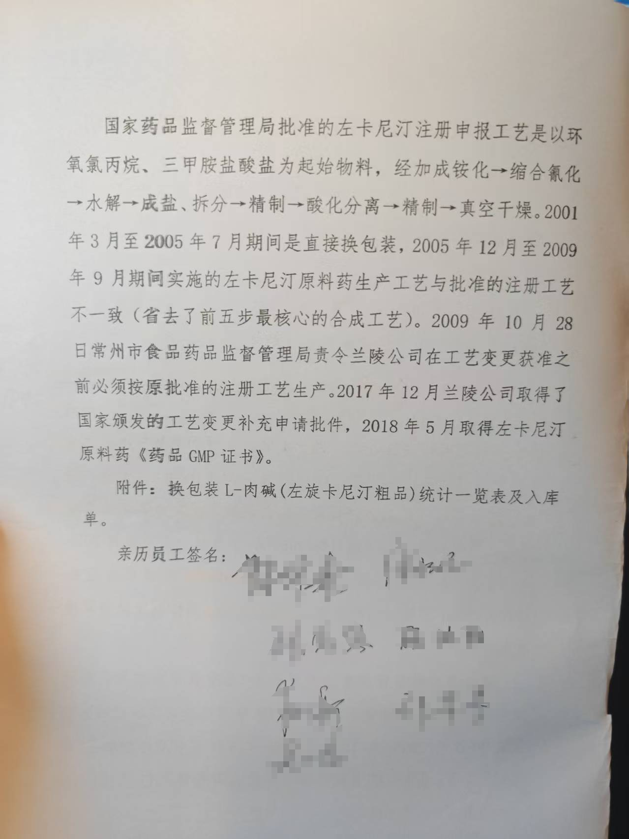 为了证实自己的说法,虞小平提供了多份药厂工人签字并按了手印的证明材料。多位药厂的一线工人证实,从2001年3月到2009年9月,兰陵制药生产的左卡尼汀注射液的原料是一家化工厂生产的L-肉碱。2005年7月之前,是直接更换外包装后使用;2005年7月开始,增加了一道“精烘包”的物理工序,但是原料仍是化工厂生产的成品L-肉碱。