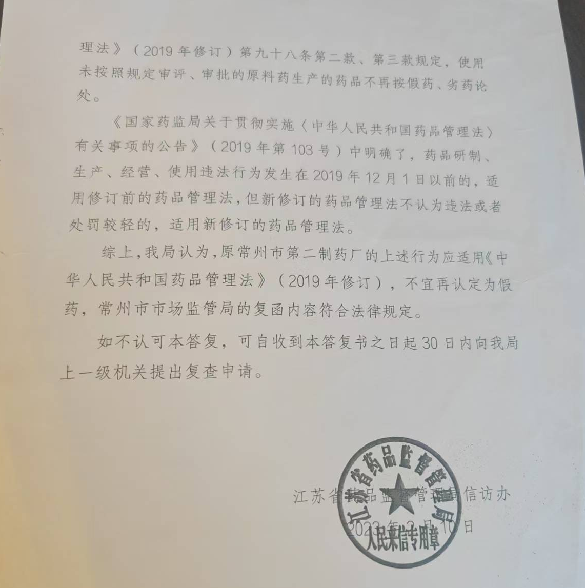 江苏省药监局先认定假药又否定的答复(当事人供图)