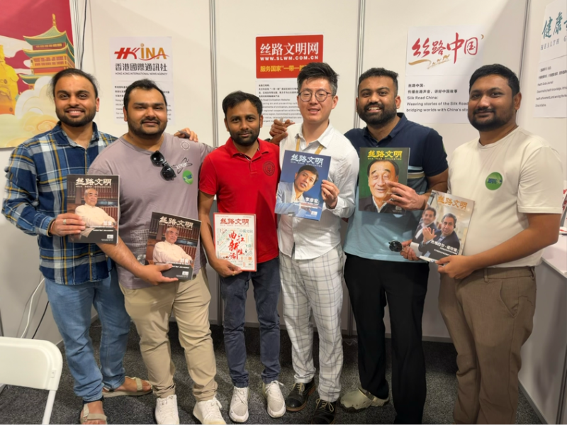 来自印度的Kaushik一行也对展位表现出浓厚兴趣。他们认真聆听了关于平台涵盖领域、受众范围以及国际合作案例的介绍。Kaushik表示,印中两国都是文明古国,在现代经济发展中亦有许多可相互借鉴之处。他们希望通过丝路中国传媒矩阵这一窗口,更深入地了解中国的产业政策与创新动态,探寻数字经济等新兴领域的合作契机。