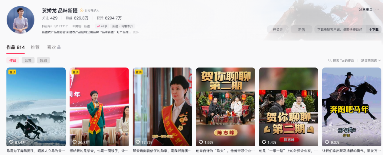 贺娇龙曾任新疆昭苏县副县长,2020年,其因为身披红斗篷,在雪原策马奔腾、英姿飒爽,走红全网,被称为“马背上的县长”。2021年,贺娇龙履新伊犁州文旅局副局长,分管旅游宣传并牵头组建自媒体协会。2023年4月,她调任新疆维吾尔自治区农产品品牌建设与产销服务中心主任,主导创建“品味新疆”区域公用品牌。长期以来,她坚持为新疆文旅推荐、新疆农产品直播带货,在抖音、微博、视频号等社交平台,相关账号累计粉丝超千万。