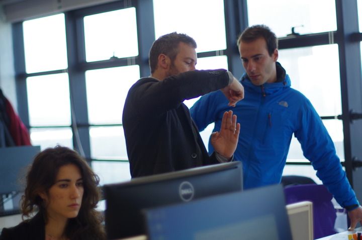 2025年5月,在斐络工业设计公司,两名意大利外籍员工在讨论电动滑板车内部结构细节,一名同事在做电脑三维手绘。受访者供图