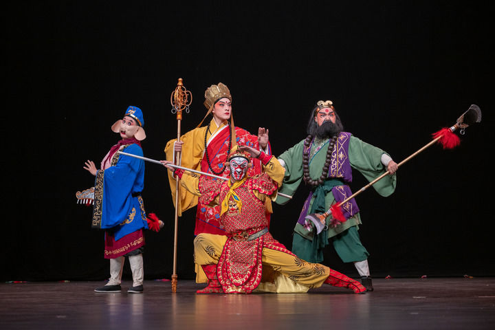 2025年9月25日,在刚果(金)首都金沙萨的金沙萨中部非洲文化艺术中心,浙江婺剧艺术研究院的演员们表演婺剧《三打白骨精》。新华社记者郑扬子摄