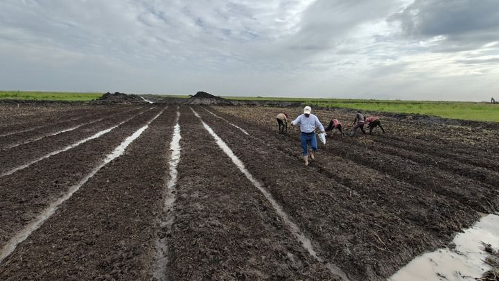 2025年11月,金华市农业科学研究院学术委员会刘新华主任(图中间者)受企业邀请,在乌干达大川农业科技有限责任公司试验田种植辣椒。受访者供图